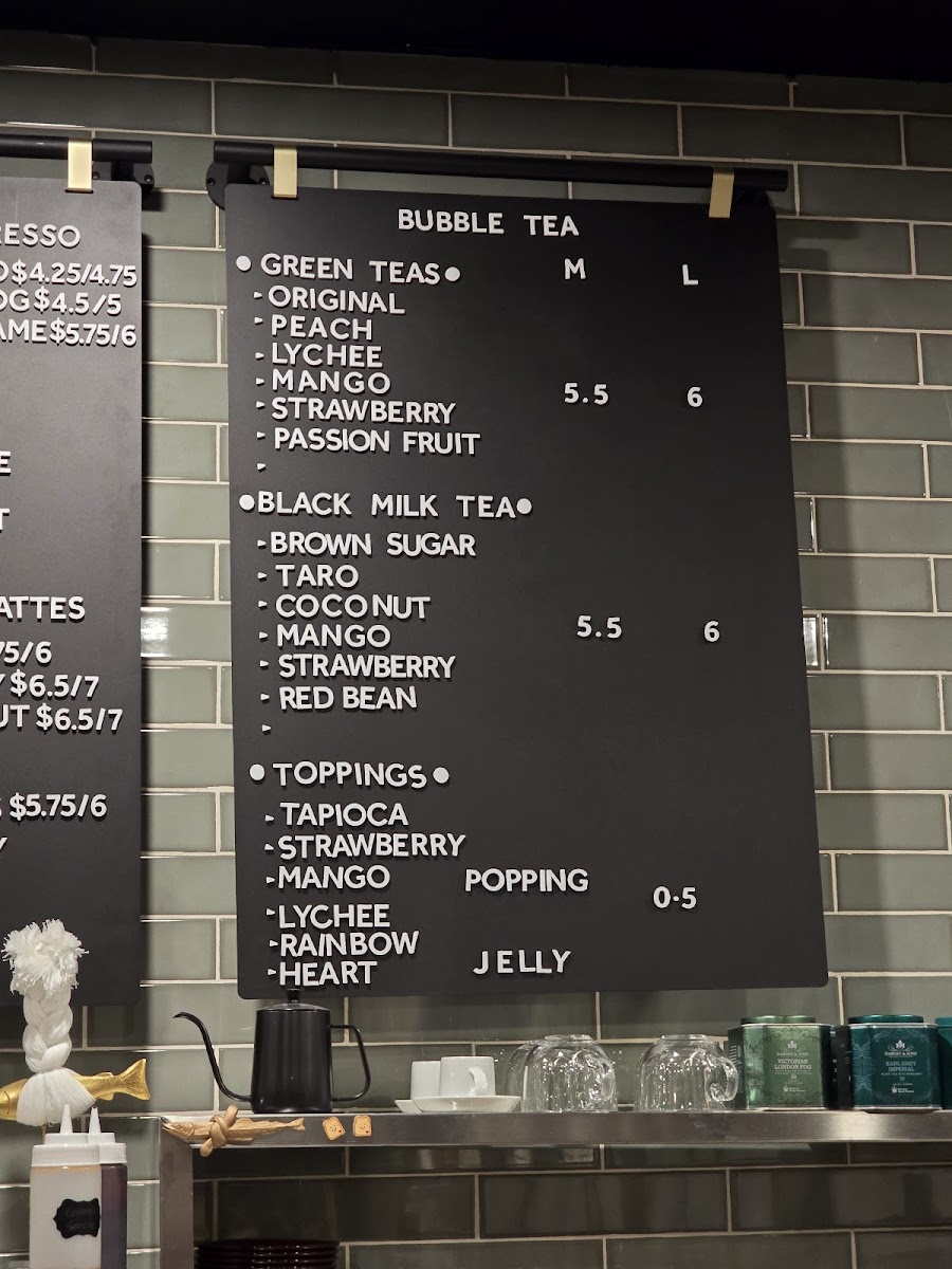 Green Teas are offered in various fruit-infused flavors such as Original, Peach, Lychee, Mango, Strawberry, and Passionfruit, each priced consistently. These teas can be accompanied by tapioca or popping bubbles as seen in the bubble tea offerings.
