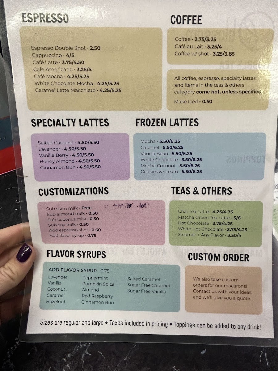 Specialty Lattes include unique flavor combinations such as Salted Caramel, Honey Almond, Mocha Coconut, Cinnamon Bun, Lavender, and Vanilla Berry. These options provide a range of coffee-based beverages with distinctive tastes.