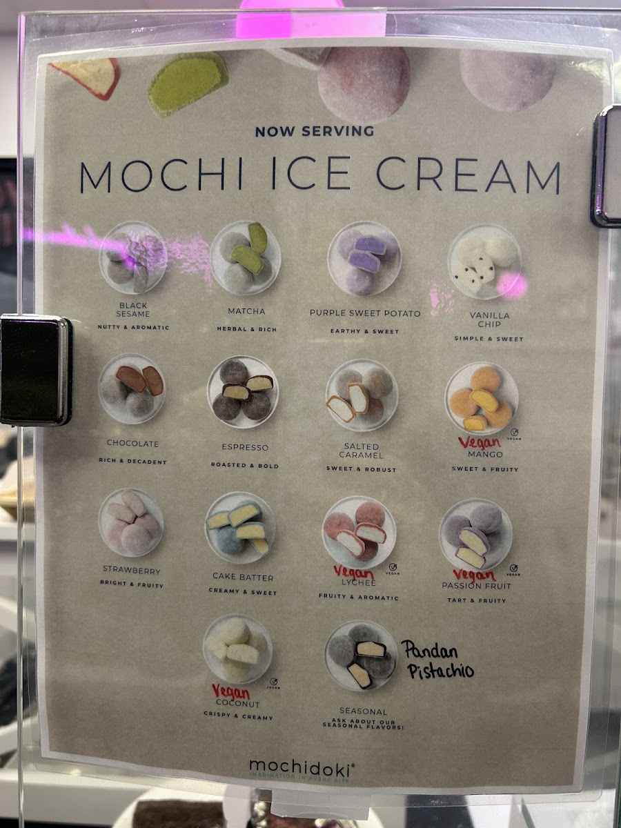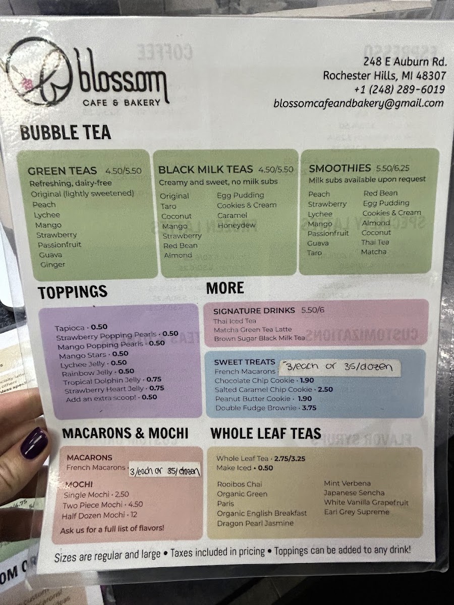 Additional menu highlights include a variety of bubble tea options such as Matcha Green Tea Latte, Mango Black Milk Tea, Taro Milk Tea, Matcha Bubble Milk Tea, Passionfruit Bubble Tea, Mango Green Tea with Bubbles, and Mango Smoothies with Strawberry Popping Bubbles. Fresh baked cookies and several types of cakes, including Birthday Cake, Cookies and Cream Cake, and Moon Cake, are also available.